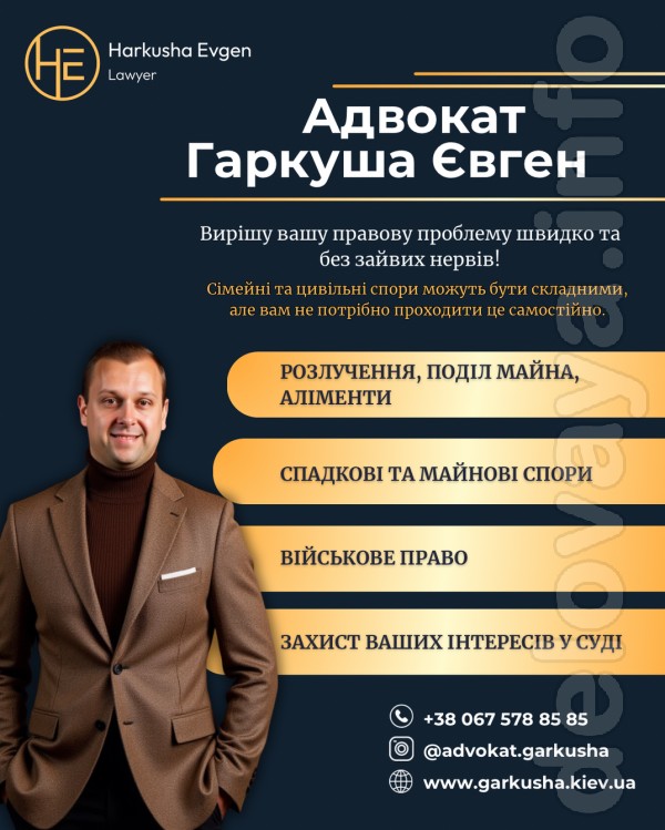 Мене звати Євген Гаркуша. Я адвокат з понад 15 роками практики. Захищаю права клієнтів у складних ситуаціях, коли потрібно не тільки знання закону, а й чітка стратегія, досвід і впевненість у кожному рішенні.
