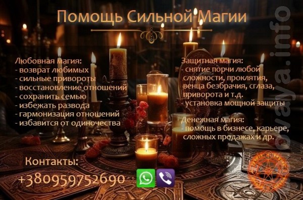 Помощь магии в решении проблем, любой сложности. Возвращение любимых, действенные привороты, сохранить семью, возвращение супругов, восстановление и гармонизация отношений, остановить скандалы, не допустить развода, найти настоящую любовь, избавиться от одиночества, ритуалы на долгожданный брак, ритуалы на постельные отношения, привязка, присуха, остановить отношения между любовниками, отворот, однополые привороты. Снятие порчи, проклятия, венца безбрачия, приворота, убрать полосу невезения, установка сильной защиты. Денежная магия, помощь в бизнесе, работе, финансах, сложных продажах и т.д. Для решения Вашей проблемы обращайтесь по указанным контактам. Огромный опыт.